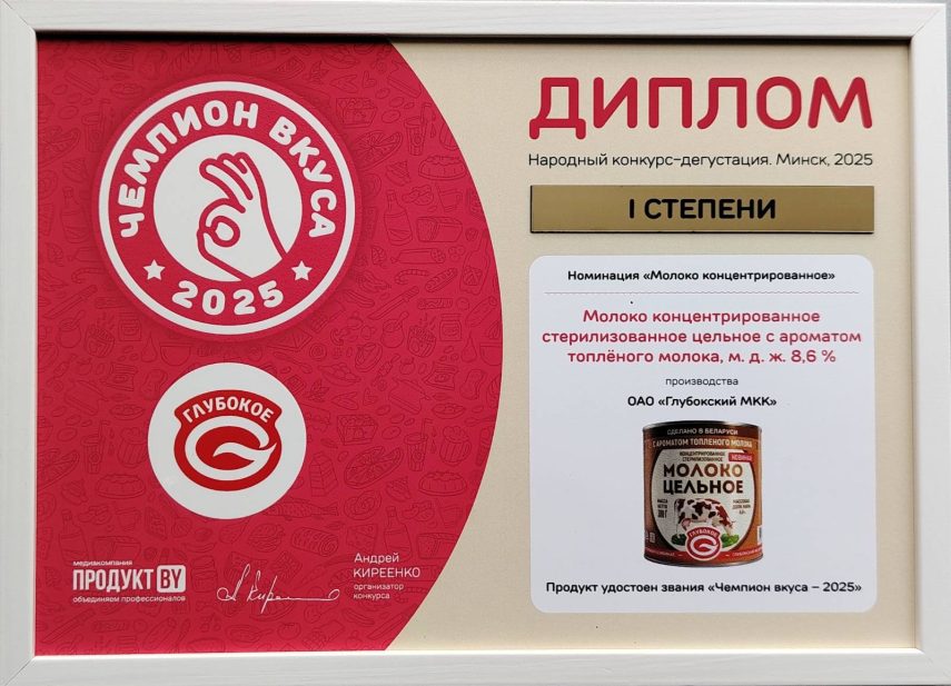 Диплом I степени в номинации «Молоко концентрированное» молоко концентрированное стерилизованное цельное с ароматом топленого молока м. д. ж. 8,6 %