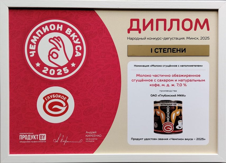 Диплом I степени в номинации «Молоко сгущённое с наполнителем» молоко частично обезжиренное сгущённое с сахаром и натуральным кофе м. д. ж. 7,0%.