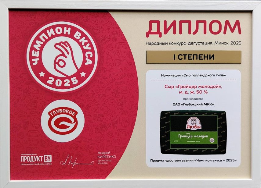 Диплом I степени в номинации «Сыр голландского типа» сыр «Гройцер» молодой , м.д.ж. 50%