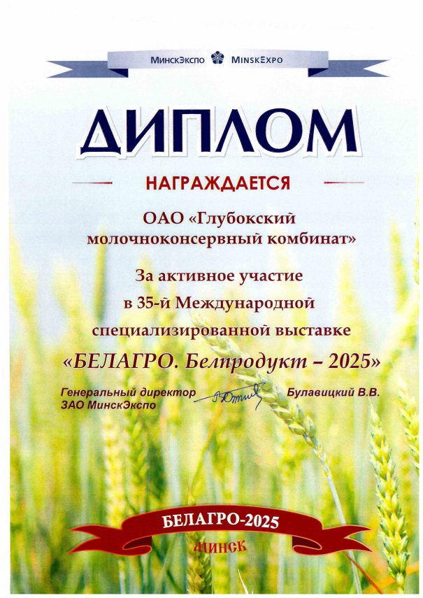 Диплом ОАО «Глубокский МКК» за активное участие в Международной специализированной выставке «Белагро. Белпродукт — 2025»