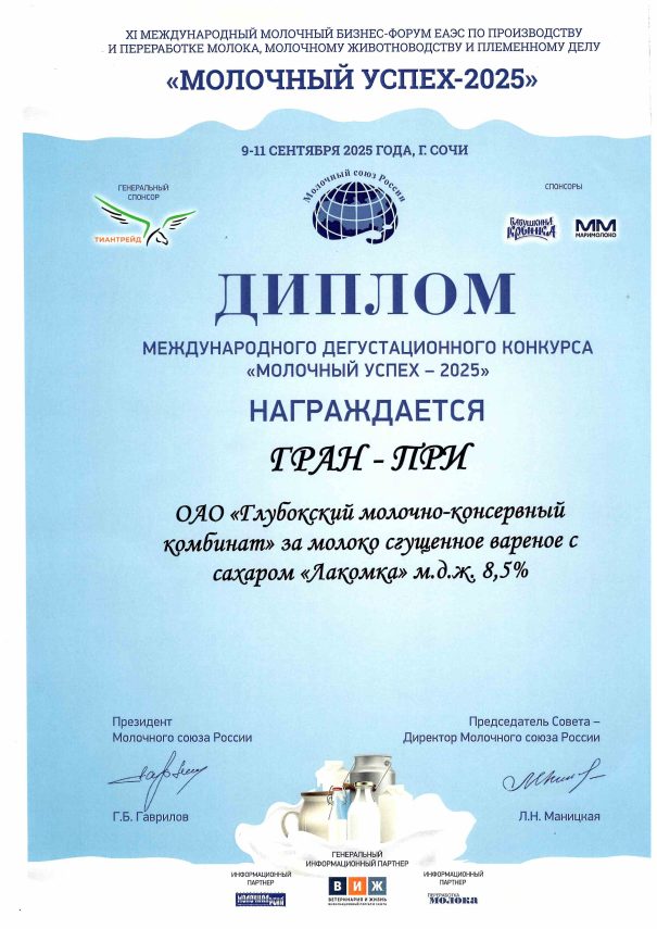 Гран — при международного конкурса «Молочный успех — 2025» за молоко сгущённое варёное с сахаром «Лакомка».